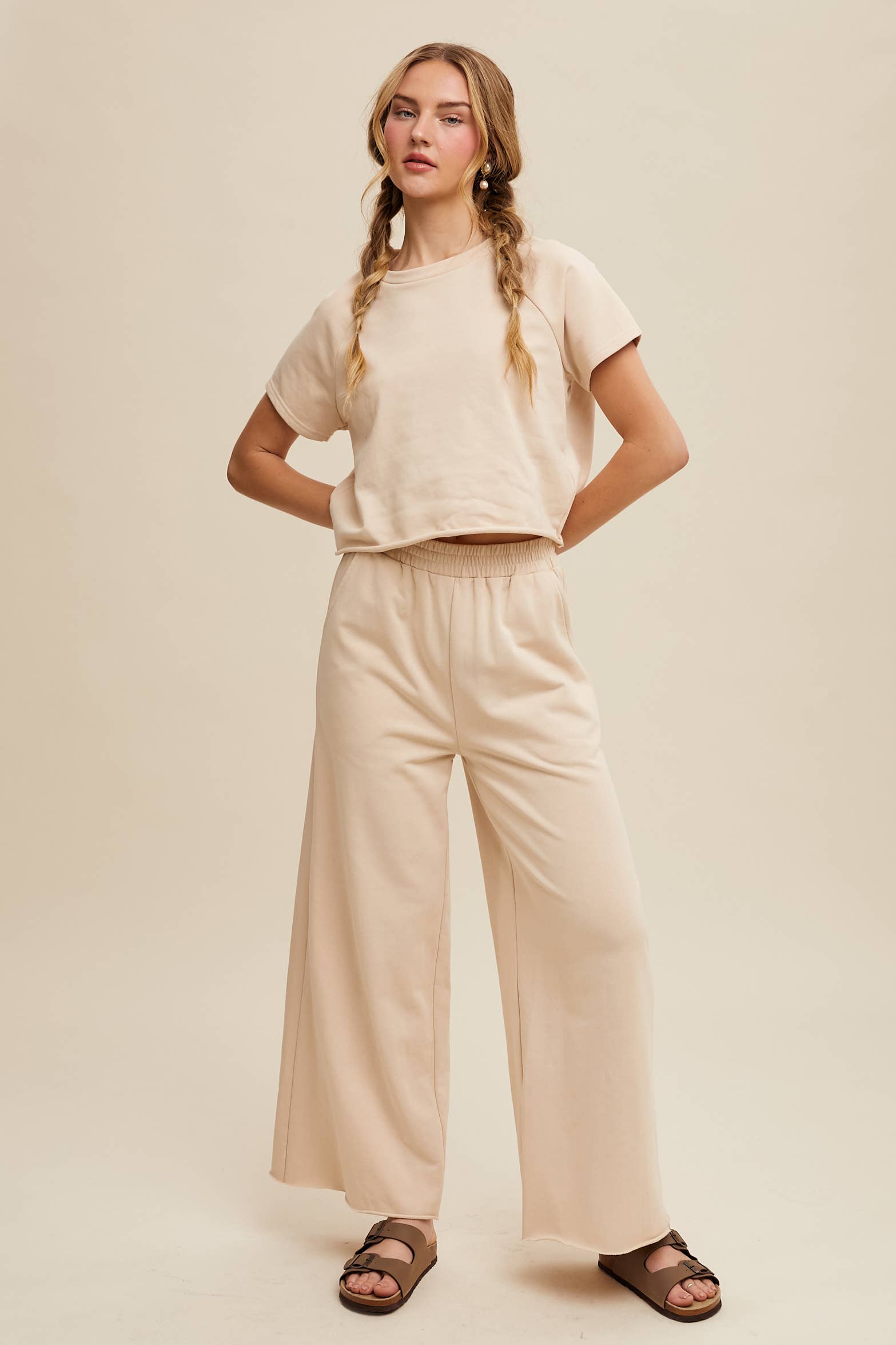 - This two-piece set includes a cropped short-sleeve top and high-waisted wide-leg pants, offering a laid-back yet polished look.